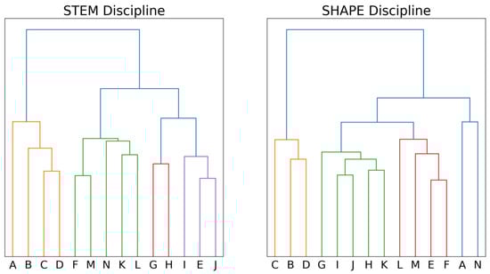 Hierarchial clustering of questions by discipline. The number of clusters for the STEM discipline is , while the number for the SHAPE discipline is .