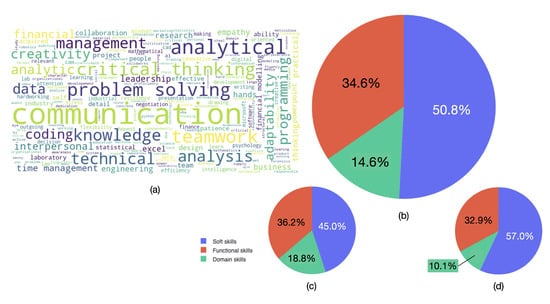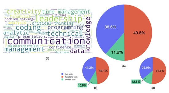 Responses to Questions 3.2 of the survey. This question asks participants to list three important skills for their desired chosen industry, collated in (a) a word cloud. k-NN clustering was used to classify the skills into four categories for (b) all survey participants, (c) among STEM participants, and (d) among SHAPE participants.