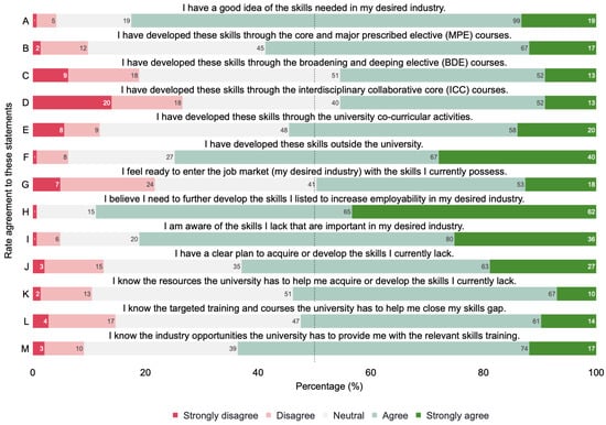 The findings of our study highlight both strengths and areas for improvement in how the university supports student awareness and utilization of resources for skills development. According to our results, as compiled in Figure 5, a significant portion of the respondents agree with the statement about their awareness of skills that are important in their desired industry (, Statement I), and naturally, fewer students have a clear plan to acquire or develop these skills. (, Statement J). Of interest, then, is how the university has supported these students. From our survey, while the majority of students recognize the availability of resources (, Statement K) and targeted training (, Statement L) within the university, this is significantly lower than the former two, suggesting that there may be a gap in how effectively these resources are integrated into their academic and career planning. Conversely, when it comes to industry opportunities, the university is seen to facilitate this (, Statement M). This indicates that while the university has been successful in sharing industry-related opportunities to close skills gaps, it may need to do more to help students connect these opportunities with their academic pathways.