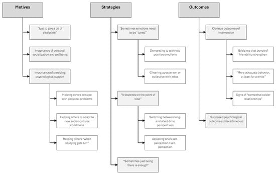 As shown in Table 4, the “Outcomes” meta-theme covers two themes, or more precisely, the clearly visible (“social”) and hypothetical (“affective” and “cognitive”) results of the participants’ attempts to influence another person’s emotions.
