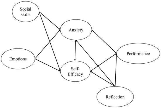 This study explores the relationships between social skills, emotions, anxiety, self-efficacy, reflection, and learning performance. These variables are interconnected through a conceptual framework; social skills and emotions influence anxiety and self-efficacy, which in turn impact reflection and performance outcomes. Reflection acts as a mediator, enhancing SRL and mitigating the negative effects of anxiety. In this model, social skills and positive emotions create a supportive learning environment, reducing anxiety and boosting self-efficacy. Higher self-efficacy enables more effective reflection, which strengthens SRL and leads to better learning outcomes. Conversely, negative emotions and low social skills exacerbate anxiety, undermining self-efficacy and reflection, ultimately hindering performance. A conceptual model (Figure 1) has been developed to illustrate these relationships. This model hypothesizes that social and emotional factors indirectly influence academic performance through their effects on self-efficacy and reflection. Reflection serves as a critical feedback loop, reinforcing SRL practices.