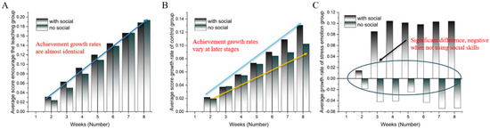 Effect of social skills and emotional states on achievement growth rates. (A) Encouragement group: Growth rates for students with and without social skills are nearly identical. (B) Control group: Growth rates diverge in later weeks, with students using social skills showing higher progress. (C) Stress group: A significant difference emerges, where students without social skills experience negative growth, while those with social skills maintain positive progress.