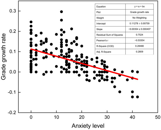We hypothesized that it might be due to anxiety that students develop and begin to resist learning in class or that immense pressure continues to reduce their self-efficacy, which leads to a decline in academic performance. Therefore, we conducted a study of anxiety levels (Table 6). The analysis of the relationship between anxiety levels and achievement growth rates in students reveals a statistically significant negative correlation, as depicted in the provided scatter plot and supported by regression analysis (Figure 4). The scatter plot illustrates a descending trend line with the equation y = −0.00354x + 0.11278, where “y” represents the grade growth rate and “x” is the anxiety level. The negative slope of −0.00354 quantitatively confirms that higher anxiety levels are associated with lower achievement growth rates. This relationship is further substantiated by the Pearson correlation coefficient (r = −0.53354), indicating a moderate negative correlation between the variables. It indicates that the higher the anxiety level, the lower the growth rate of achievement. In the regression analysis, the model presents a constant (B = 0.041, p < 0.001), indicating the expected grade growth rate when anxiety is absent. The coefficient for anxiety level (B = −0.004, p < 0.001) is particularly telling, as it suggests that for each unit increase in anxiety, there is a decrement of 0.004 units in the grade growth rate. Additionally, the coefficient for the time variable, “week” (B = 0.016, p < 0.001), shows a positive effect, illustrating that regardless of anxiety, grade growth rates improve over time, likely reflecting learning progression and adaptation throughout the course duration. The regression model’s adjusted R-squared value of 0.2809 implies that approximately 28.09% of the variability in grade growth rates is accounted for by the model. While this indicates a moderate explanatory power, it also suggests that other factors not included in the model might play significant roles in influencing academic performance.