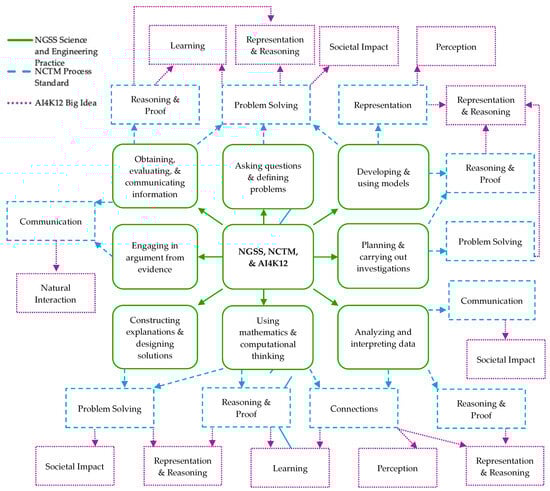 Moreover, STEM content and academic standards naturally align, such as the National Council of Teachers of Mathematics (NCTM) process standards and the Next Generation Science Standards (NGSS; Holman & Kohnke, 2024). For example, the NGSS science and engineering practice of using mathematics and computational thinking directly overlaps with mathematics standards. Furthermore, mathematics and science standards and practices align with the AI educational guidelines (e.g., AI4K12 guidelines and big ideas). For example, the NGSS science and engineering practice of constructing explanations and designing solutions aligns with the NCTM process standard of problem solving. Both then align with AI4K12’s big idea of societal impact. The authors of the present article further illustrate the alignment between the AI4K12 guidelines, the NGSS scientific and engineering practices, and the NCTM process standards in Figure 1. While the transdisciplinary intersection needs further research, the intersection of AI4K12 and NGSS is evident in the recent literature. Touretzky and colleagues illustrate how the NGSS crosscutting concepts (i.e., patterns, systems, and system models) and the science and engineering practices (i.e., asking questions and defining problems, developing and using models, planning and carrying out investigations, analyzing and interpreting data, constructing explanations and designing solutions) align with the skills required for STEM and AI education (Touretzky et al., 2023).