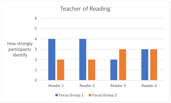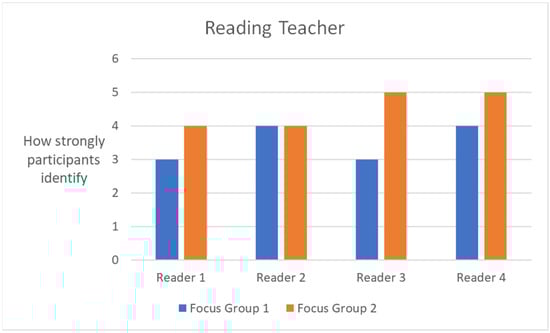Figure 7 and Figure 8 display the results from participant responses to a Likert Scale question, asking them to rank how strongly they identified with each literate identity after each focus group. At the start of the study, participants, represented in Figure 7, identified more closely with being a Teacher of Reading. The second focus group revealed that participants maintained a similar perception of being a Teacher of Reading; however, as seen in Figure 8, their Reading Teacher identities increased. Figure 8 reveals the shift in identity that participants perceived after engaging with RfP practices over the course of the study, as they moved towards a Reading Teacher identity and a more balanced perception of a Teacher of Reading identity. The pattern of results also shows that all readers identified somewhat moderately as Reading Teachers in the first focus group. Reader 2’s identity remained the same after both focus groups; however, her Teacher of Reading identity was less strong at the end of the study. Reader 4 started with a strong Reading Teacher identity, despite being less of a reader. Reader 3 is the only participant to have strengthened both of her literate identities. There are many factors that could influence these patterns. For example, Reader 2’s response could be more heavily influenced by her professional literate identity, with the book club meetings reinforcing an already stable identity. Reader 1, who began with a strong personal reading identity, showed an incremental change in identity.