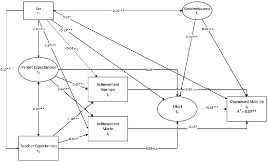 Model 1, with downward mobility as the dependent variable, showed a good fit (χ2(105) = 266.600, p < 0.001, CFI = 0.97, RMSEA = 0.03, SRMR = 0.05; Figure 1). The adolescents’ downward mobility was significantly predicted by their effort in 9th grade (β = −0.18, p < 0.001) and by their academic achievement in 7th grade in mathematics (β = −0.15, p = 0.020) but not in German (β = −0.03, p = 0.328; H1a partially accepted; H1b accepted). Parent expectations (β = −0.09, p = 0.014) and teacher expectations (β = −0.04, p = 0.025) indirectly predicted downward mobility. The adolescents’ achievements in mathematics served as a mediator for the effects of parent expectations (β = −0.06, p = 0.023) and teacher expectations (β = −0.03, p = 0.031) on downward mobility. The adolescents’ achievements in German also did not mediate effects of parent expectations (β = −0.01, p = 0.328) or teacher expectations (β = −0.01, p = 0.330; H2a and H2c partially accepted). However, the adolescents’ effort did not serve as a mediator for the effects of parent expectations (β = −0.02, p = 0.053) or teacher expectations (β = −0.01, p = 0.140) on downward mobility (H2b and H2d rejected). Of the control variables, the adolescents’ gender significantly predicted downward mobility, with male adolescents showing a higher probability (β = −0.09, p = 0.015).
