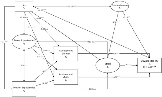Regarding the control variables, direct effects on upward mobility existed for conscientiousness (β = −0.13, p = 0.006) and gender, with female adolescents showing a higher probability of upward mobility (β = −0.20, p < 0.001).