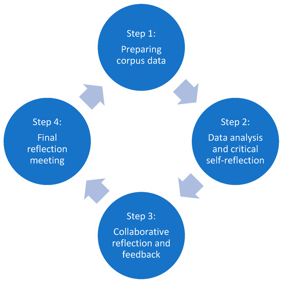 Stages of the corpus-based reflective practice project (although our project was concluded after step 4, we included an arrow from step 4 back to step 1 in this visualization to highlight the iterative potential of the reflective practice framework).