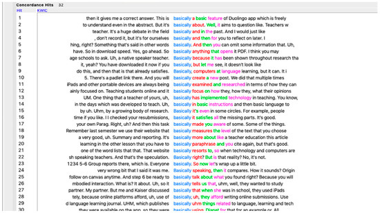 When we had prepared our corpora and loaded them into AntConc, we proceeded to analyse our language use and reflect on it individually, keeping analysis and reflection journals. We generated frequency lists and keyword lists (with BASE as our reference corpus) in order to identify unusually frequent words, e.g., content words found among the 50 most frequent words in our corpora or words with a high keyness value compared to BASE. Figure 2 shows examples of the adverb basically, appearing unusually frequently in one of our corpora.