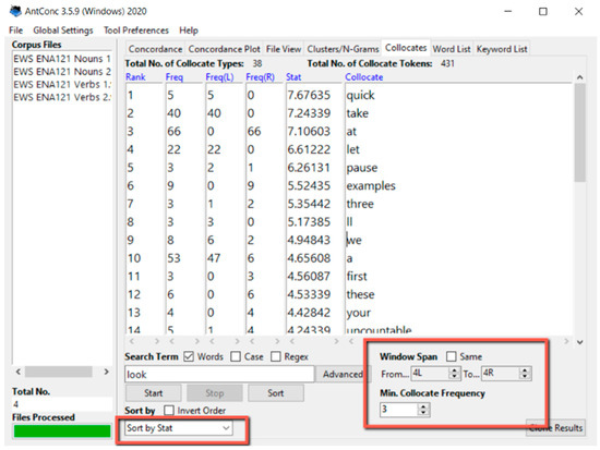 We then explored some of the unusually frequent words further by using the Collocate, Cluster/N-gram and Keyword-in-Context (KWIC) tools in AntConc to identify usage patterns. To facilitate reflection, we were guided by the following questions: What function does the use of these words serve? Can I omit or replace them? Do these words appear in patterns? We took notes and screenshots of any patterns we found. For example, one of us identified the verb look as an interesting point for reflection as it was a content word with an unexpectedly high frequency. By studying the collocates of look (Figure 3), and then further exploring concordance lines with this keyword, it was possible to identify a larger usage pattern involving the construction (so) let’s take a look at (Figure 4).