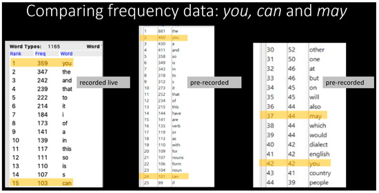 As illustrated in Section 4 below, these kinds of discoveries then led to deeper reflections on speaking styles, audience engagement, the merits of exposing our students to different spoken registers, and the potential of using corpus linguistic analysis not just for identifying usage patterns but also for discovering pedagogical aspects of language use.