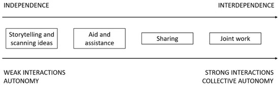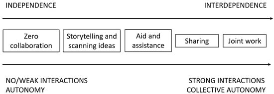 Collaboration as interaction is distinguished by range, location, frequency, focus, concreteness, relevance, reciprocity, and inclusivity (Little, 1990). According to Biro (2003), teachers’ joint work may be best conceptualized as a continuum that most precisely reflects the depth of collaboration, starting with the most independent forms of action (Hargreaves, 2019), which assume weak interactions and high autonomy (Vangrieken & Kyndt, 2020), and moving toward more interdependent forms of action with stronger interactions (Figure 1). Interactions between teachers are the action of collaboration, and the glue of these interactions is the communication that develops mutual understanding. Interaction and communication, however, may not lead to collaboration (Smith, 2009). A good example of this is the first unit on the teacher–teacher interaction continuum—storytelling and scanning ideas (Little, 1990).