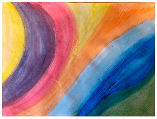 Another teacher education student chose to show this in their artwork, explaining “Each one of the colours represent our lives, individuals and people, and how we all flow together, mesh together, and you have to learn to grow together, learn together, talk about different things, and all of our ideas flow and add a different layer of understanding. Working together as a team to achieve a common goal of learning.” (Artwork 3, 2018, see Figure 3).