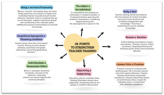 Although the responsibility for building a better present or training citizens prepared for peace does not fall exclusively on teachers, as this task involves structural changes and government policies, it is undeniable that they play a central role in this process. Macedo et al. (2023) systematizes eight points to strengthen teacher training in Figure 1.