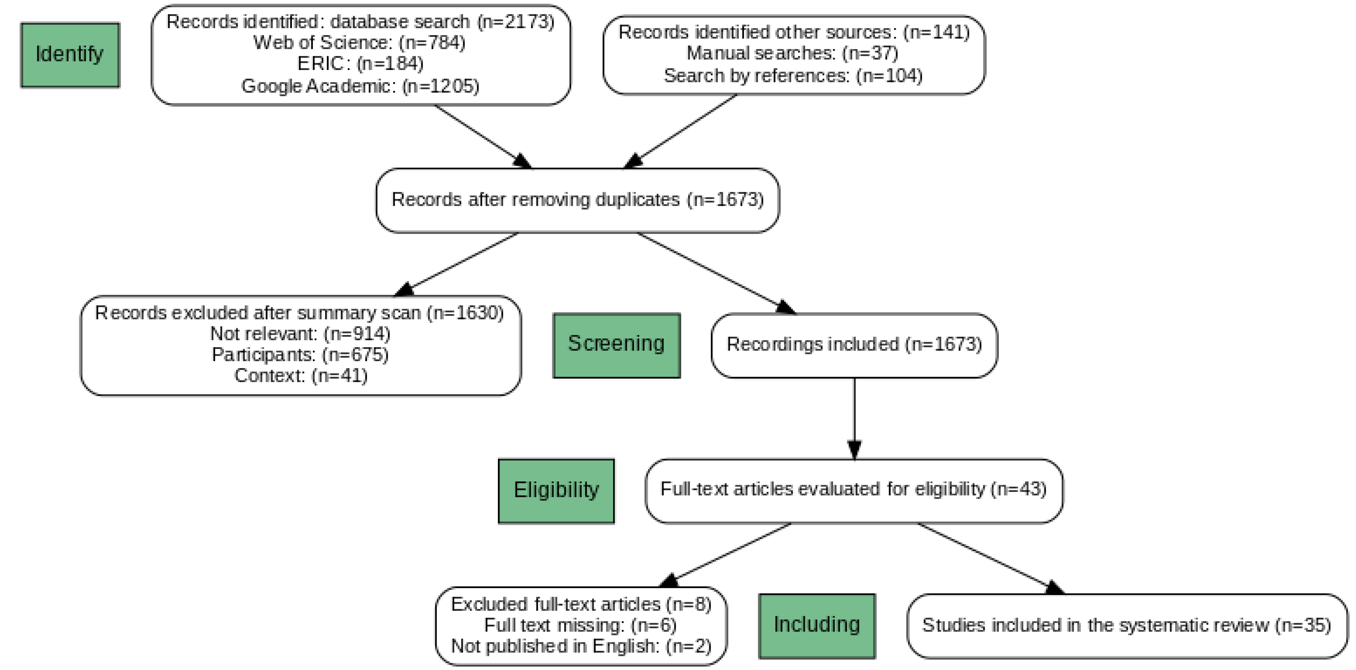 - The study had to address a topic related to makerspaces, inside or outside of the school context, and entrepreneurial competences and/or a related concept (e.g., makerspace, EntreComp, Fab Labs, entrepreneurial mindset, entrepreneurship education, etc.);