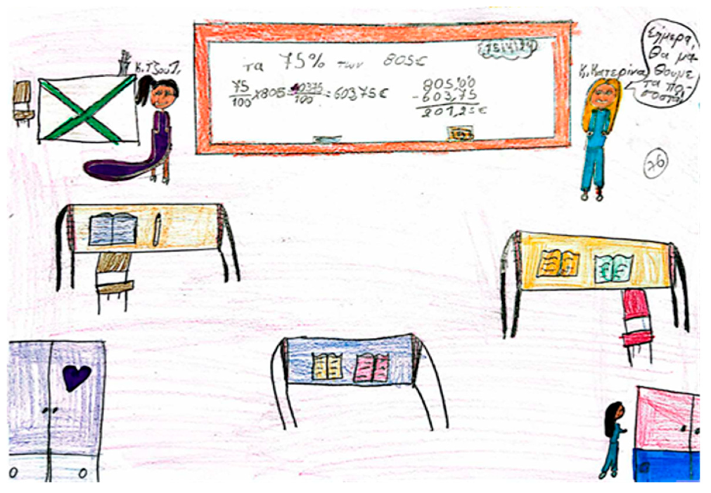 Figure 7b shows teachers in a larger size than in real life. A possible reason for this discrepancy may be that bigger size reflects children’s respect towards the teacher as an important figure, while real size reflects a rather balanced, realistic approach.