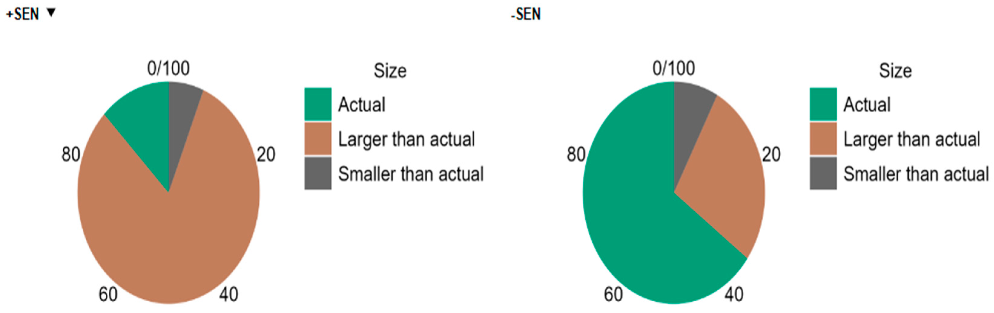 p = 0.046; Cramer’s V = 0.42; 95% CI [0.28–0.83] for students without SEN; [0.02–0.40] for students with SEN]. In addition, 81.3% of the students with SEN drew the SET in a larger size than the actual, while only 27.2% of the students without SEN did so, with the remaining 64% depicting SETs in their actual size [χ