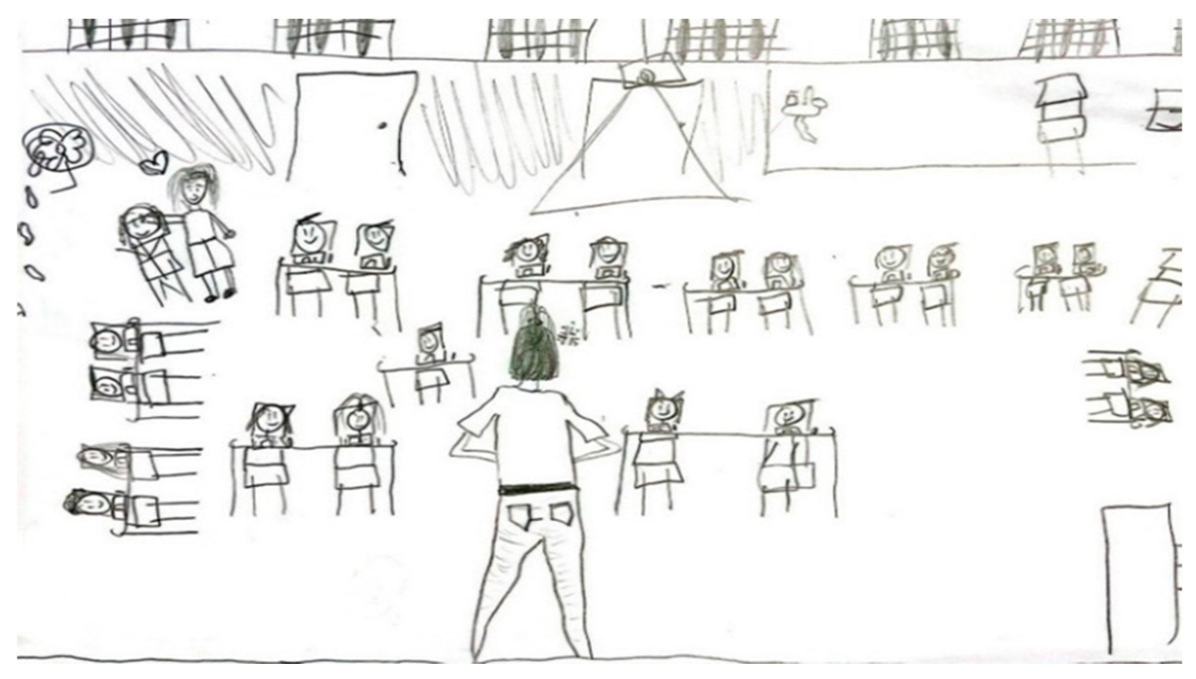Figure 12 below focuses on the disposition of the teachers and the instructional setting in the classroom. One can see that the GET stands in front of the students teaching them, while the SET is next to a child touching her shoulder. A heart painted over the teacher probably indicates the expression of love from the student towards the SET.