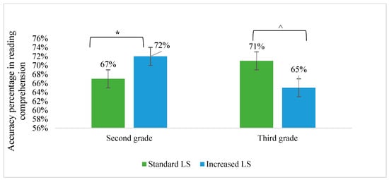 As expected, in the second grade, increased LS yielded a significantly higher RC (M = 0.72, Sd = 0.29) than the standard LS condition (M = 0.67, Sd = 0.28), F (1, 162) = 4.57, p < 0.05, η2 = 0.03. In the third grade, results indicated an approaching significance opposite trend, with higher comprehension in the standard LS condition (M = 0.71, Sd = 0.26), compared to the increased LS condition (M = 0.66, Sd = 0.26), F (1, 125) = 3.37, p = 0.07, η2 = 0.03. Figure 2 presents the differences in RC between the two LS conditions in the second and third grades.