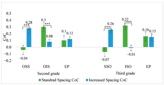 The next step of analysis focused on examining whether the CoC of children is dependent on their optimal LS display for performance. Separate t-tests on CoC were performed for the three groups in both grades. The analyses in the second and third grades confirmed our expectations. The OSS group was significantly more calibrated in the standard LS than the increased LS [t(34) = 5.86, p < 0.001, Cohen’s d = 0.32 for second grade; t(50) = 8.42, p < 0.001, Cohen’s d = 0.28 for third grade]. The OIS group showed an opposite significant trend, by which CoC was more accurate on the increased LS condition, compared to the standard LS condition [t(64) = 6.56, p < 0.001, Cohen’s d = 0.26 for second grade; t(29) = 8.60, p < 0.001, Cohen’s d = 0.22 for third grade]. There was no effect of spacing on the EP group, indicating similar CoC in both conditions. Descriptive statistics and t-values are presented in Table 2 and Figure 3.