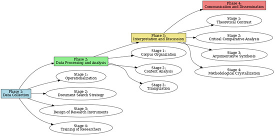 The process was organized into four phases, each supported by specific research techniques and tools: (1) data collection; (2) information processing and analysis; (3) interpretation and discussion of results; and (4) communication and dissemination of findings.