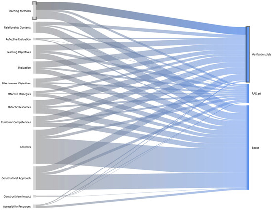 Using Atlas.ti 25, the entire corpus was coded with the support of the software’s AI-driven intentional coding, identifying conceptual patterns and key teaching characteristics. To determine the frequency of occurrence of each category in the different sources, a code-document analysis was performed, visualized with a Sankey diagram. A code co-occurrence analysis was also carried out to reveal significant relationships between categories. This procedure explored the thematic intensity and connections between key didactic dimensions in books, lists, and articles.