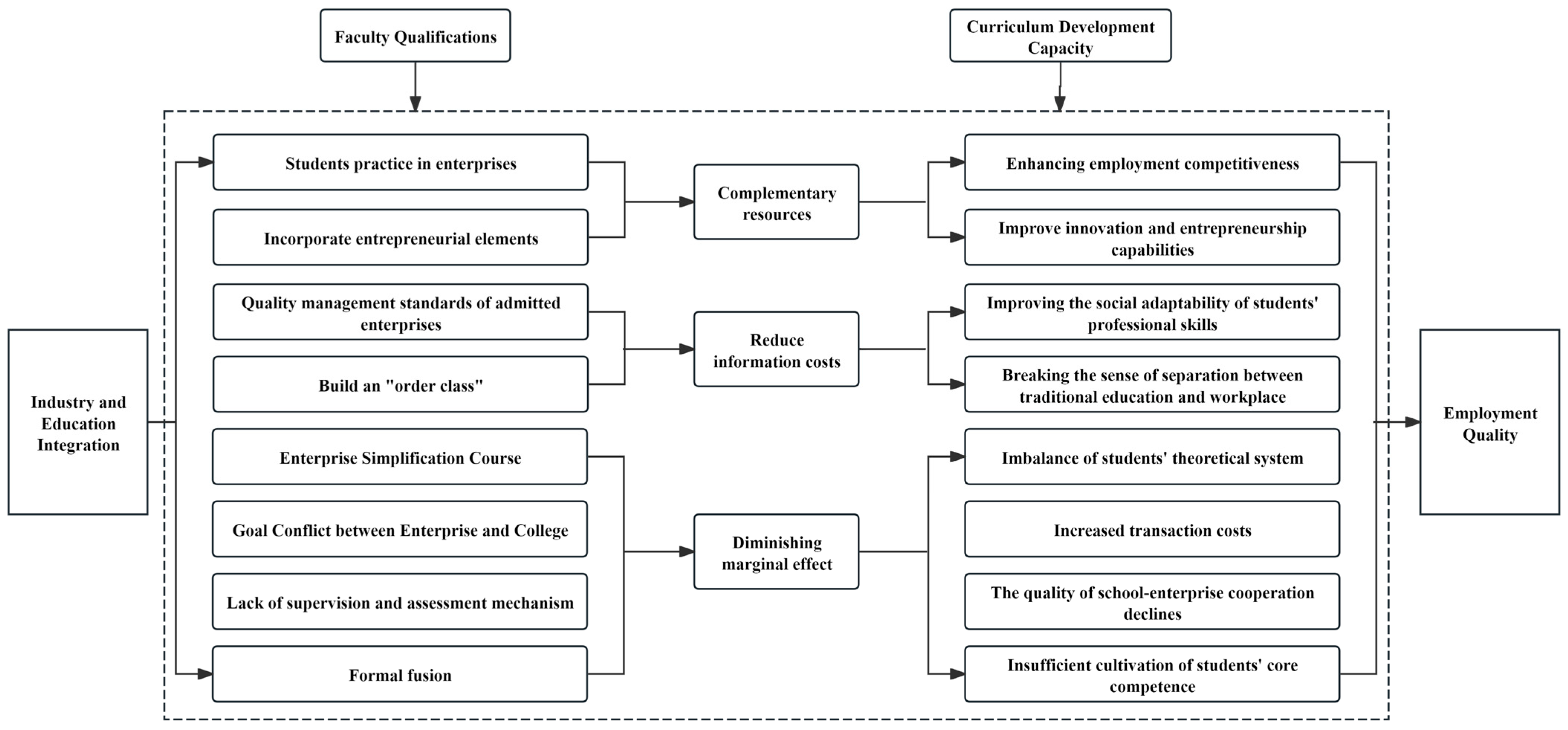 In summary, the level of industry–education integration influences employment quality, mediated by faculty qualifications and curriculum development capacity. Initially, an increase in industry-education integration helps reduce information asymmetry, encourages educational institutions to align skill training more closely with industry needs, and enhances the alignment between talent development and job requirements, thereby improving the Employment Quality. However, as the level of industry–education integration increases beyond a certain threshold, excessive integration may lead to diminishing or negative returns due to increased transaction costs, goal misalignment, and opportunistic behaviors, especially when teacher qualification and curriculum-development capacity lag behind the pace of integration. This results in an inverted U-shaped relationship between the level of industry-education integration and employment quality. Furthermore, the negative moderating effects of teacher qualification level and curriculum development capacity help mitigate the risks associated with excessive integration. Highly qualified teachers act as stabilizers and institutional bridges, ensuring educational quality and systematic training, while strong curriculum development capacity maintains the structure and relevance of educational content, thereby preserving employment quality even at high levels of integration.