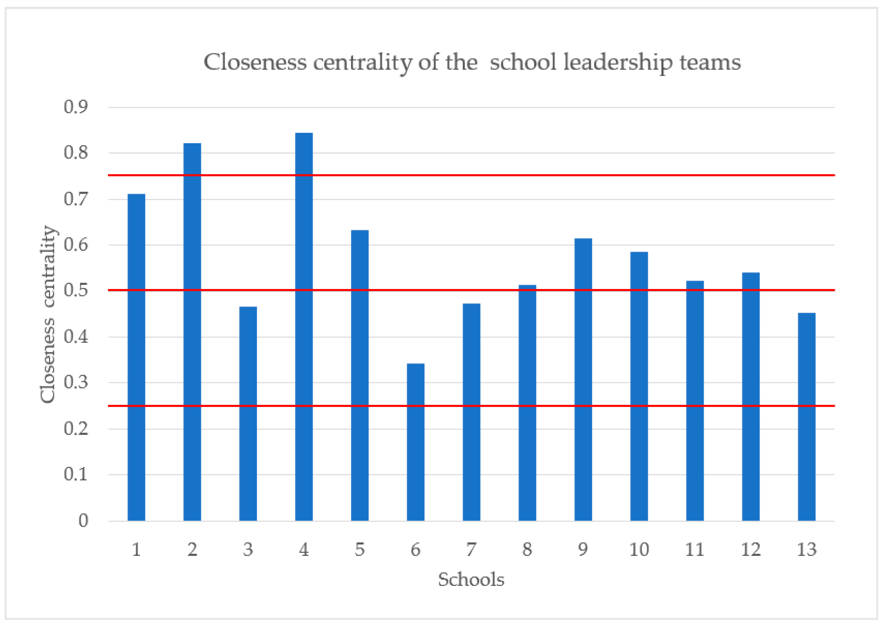 Figure 2. Means of the closeness centrality of the school leadership teams of the 13 participating schools.