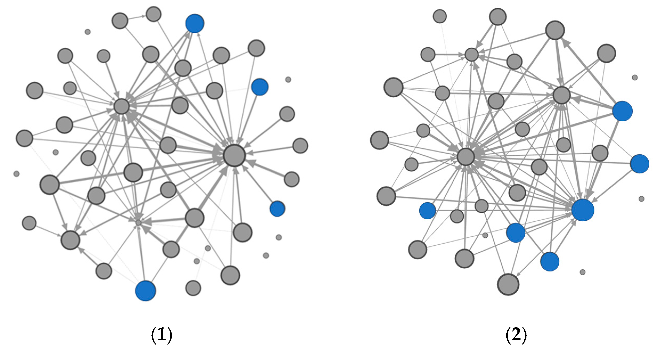 Figure 3. Illustration of the social networks of two schools (1,2) with nodes marked in blue, which show the members of the school leadership teams.