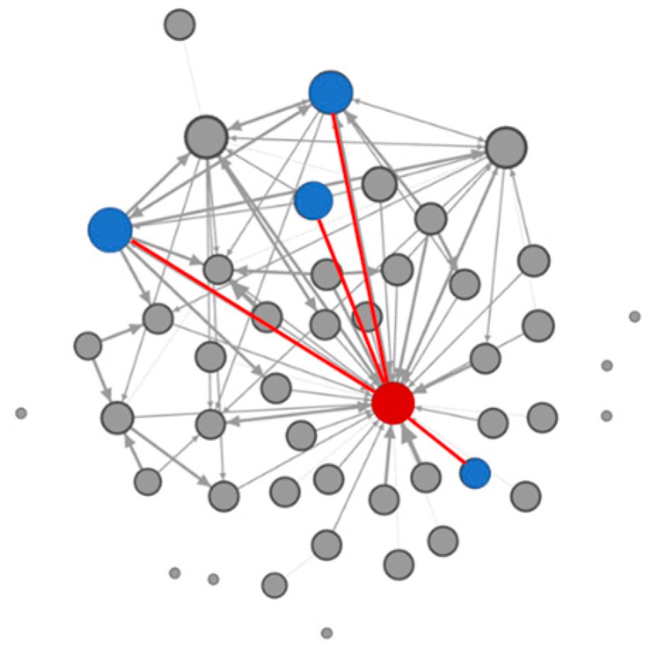 Figure 5. Illustration of the social network of school (4) focusing on the connections between the school leadership team and the digital coordinator. Nodes marked in blue show the members of the school leadership team; red node shows the digital coordinator; red edges show their connection.