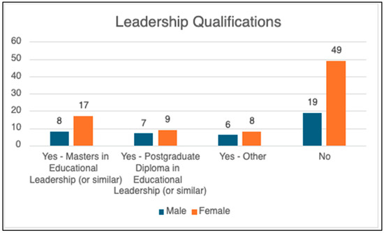 The data presented in Figure 1, Figure 2, Figure 3 and Figure 4 shows that female participants make up the majority, accounting for 67.5% compared to 32.5% male participants. For a broader perspective, males make up around 21% of the education workforce in Ireland, accounting for both primary (15%) and post-primary (32%) level. Turning attention to the most senior school role of principal, males account for approximately 34% of primary school principals and 55% of post-primary school principals, far outweighing their gender share of the general educational workforce (Department of Education and Youth, 2025). At both the primary and post-primary school levels, females outnumber males, with the gap being largest at the primary level, where there are twice as many females (50) as males (25). In terms of school roles, females dominate across most categories. The majority of teachers are female (42 compared to 22 males), and females also hold more leadership positions, such as Assistant Principals, Deputy Principals, and Principals. It is worth noting that a participant can hold two roles, such as being both a teacher and an assistant principal, which may explain some of the overlaps in role distribution. For example, there are 22 female Assistant Principals (Level 1 and 2) compared to just seven males, and 10 female Deputy Principals compared to only one male. The Principal role is more balanced but still female-leaning, with 18 females compared to 14 males. Interestingly, the role of Guidance Counsellor is almost absent, represented by just one female. Overall, the breakdown highlights a strong female majority both in numbers and in leadership positions across school levels, but it should be noted that despite comprising a 67.5% majority in the overall survey numbers, females only account for ~56% of the top senior leadership positions—the role of principal.