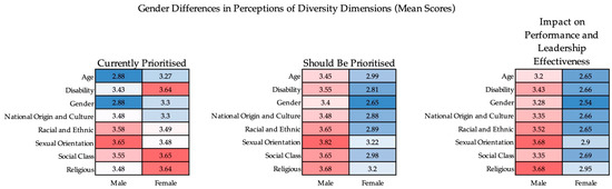 Heatmap for gender differences in perceptions of diversity dimensions (mean scores across “currently prioritised”, “should be prioritised”, “impact on performance and leadership effectiveness”. Each heatmap has been displayed on its own merits to distinctly demonstrate the difference of scores, they have not been compared to one another for the purpose of these graphics, blue indicating the lower mean score i.e., “more agreeable”, red indicating a higher mean score i.e., “less agreeable”).