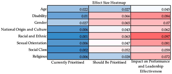 Heatmap for effect sizes in perceptions of diversity dimensions (mean scores across “currently prioritised”, “should be prioritised”, “impact on performance and leadership effectiveness”).