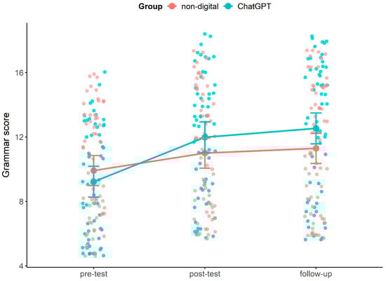 Grammar scores over time. Point with error bar: mean and 95% confidence interval. Dot: individual score. Both groups improved over time, but no significant between-group difference emerged.