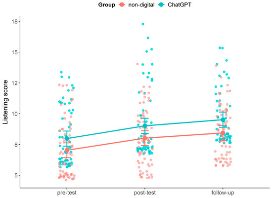 Listening comprehension scores over time. Point with error bar: mean and 95% confidence interval. Dot: individual score. The ChatGPT group had superior listening comprehension scores compared to the conventional group across all time points.