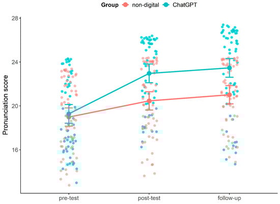 Pronunciation scores over time. Point with error bar: mean and 95% confidence interval. Dot: individual score. The ChatGPT group showed consistently larger gains in pronunciation than the comparison group.