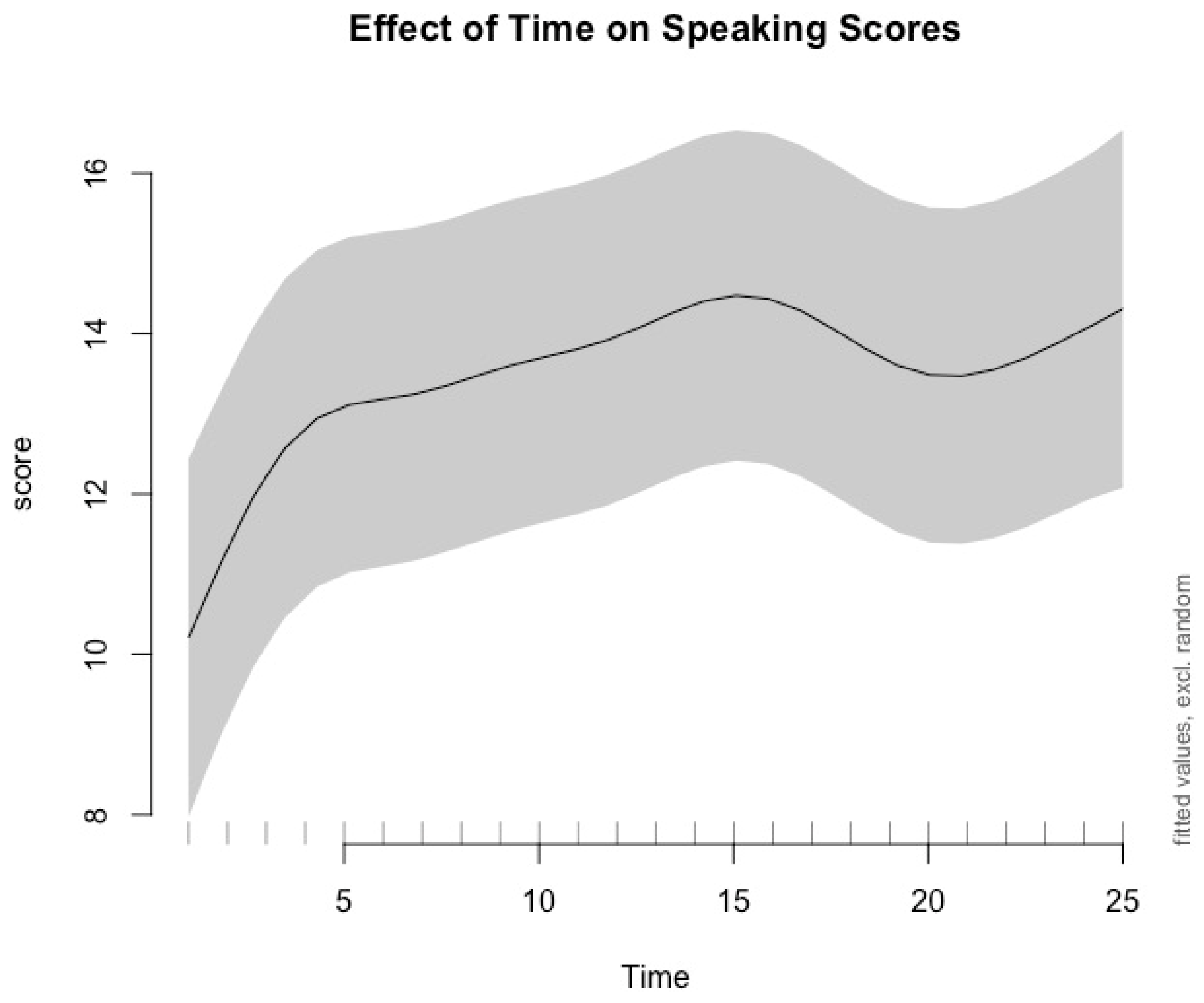 bestmodel <- bam(score ~ s(Time, k = 10) + s(PPVT) + ti(Time, cPPVT, k = c(10, 10)) + s(Time, ID, k = 10, bs = ‘fs’, m = 1) + s(Task, k = 7, bs = ‘fs’, m = 1), data = mydata)