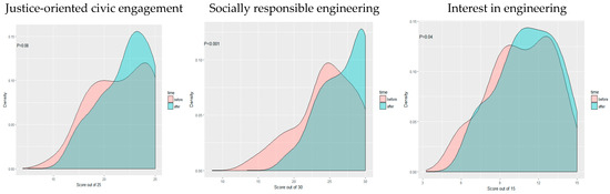 Students from under-represented racial and ethnic backgrounds also had higher median scores on the pre-semester measures of justice-oriented civic engagement and socially responsible engineering (median scores of 24 and 25.5 for under-represented students vs. 21 and 24.5 for others out of 25 and 30 possible, respectively). They also expressed greater interest in engineering in the initial survey (median score of 13 for under-represented students vs. 10 for others, out of 15 possible) and were more likely to choose to participate in a community-engaged project than other students (43% vs. 25% rates of participation, respectively). None of these differences were statistically significant. We found no statistically significant differences between the initial attitudes of project participants compared to students who did not participate in projects in the pre-semester survey (median score of 24 for project participants vs. 21 for others out of 25 for justice-oriented civic engagement; median score of 26 vs. 24 out of 30 for social justice in engineering; median score of 10 vs. 11 out of 15 for interest in engineering; all p > 0.10, Wilcoxon signed rank tests).