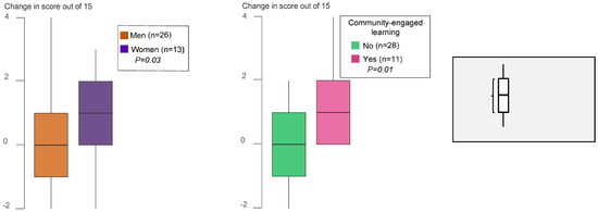 Changes in interest in engineering in matched pre- and post-semester survey responses (total N = 39). Higher scores indicate a greater increase in interest in engineering. p-values are from a Kruskal–Wallis test of the null hypothesis of no difference between groups.