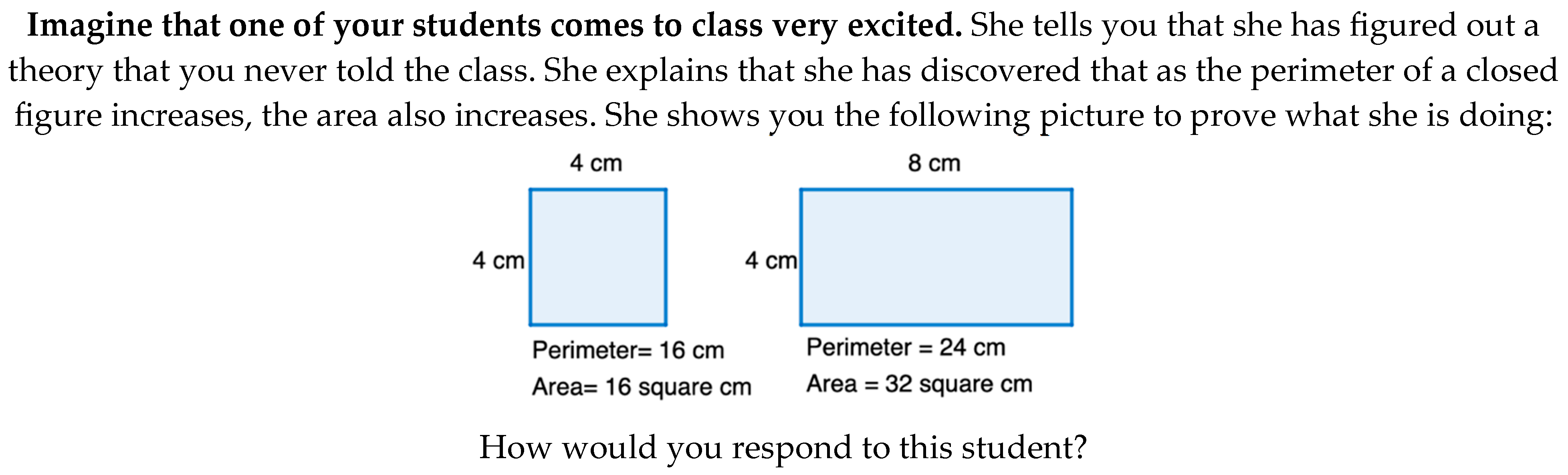 - Widjaja, W., & Vale, C. (2021). Counterexamples: Challenges faced by elementary students when testing a conjecture about the relationship between perimeter and area. Journal on Mathematics Education, 12, 487–506. [Google Scholar] [CrossRef]