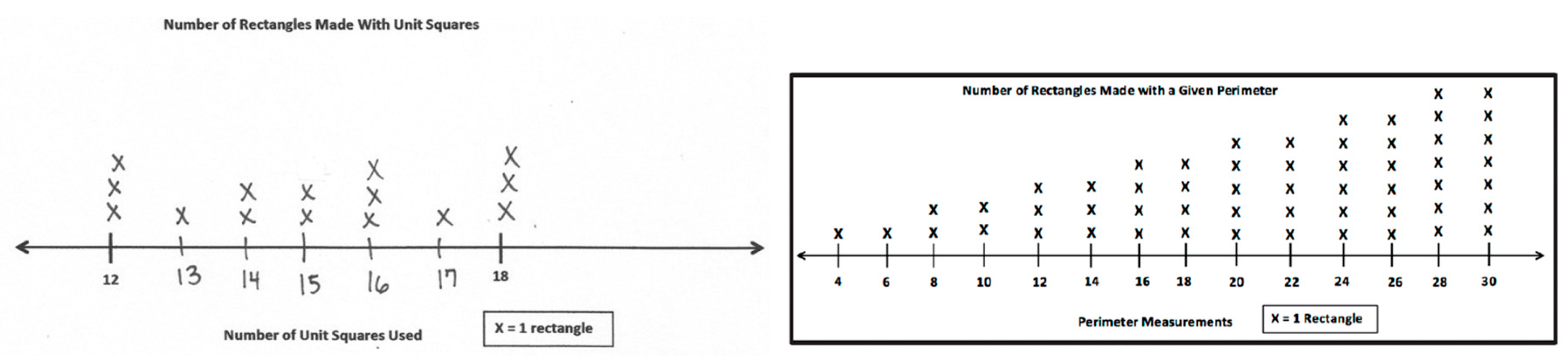 M7TDL19 | Application problem; build rectangles with areas 13–20; create line plots | The number of possible rectangles related to factor pairs of the area and recorded using line plots. |