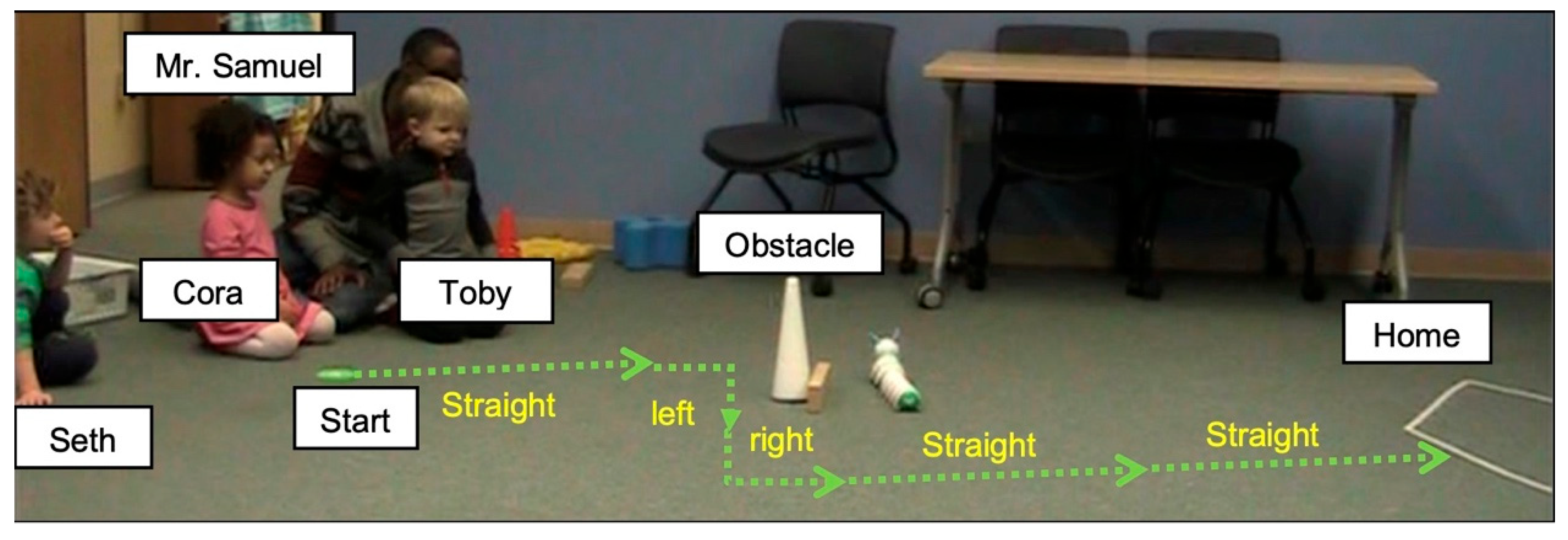 2023) argue that moments of failure present important opportunities to examine emotional responses. In this case, Mr. Samuel foregrounded managing emotions and inhibitory control as a group instead of immediately preceding to debug for a resolution. He appealed to children’s body/ego syntonicity with Rapunzel by offering a relatable explanation (“She forgot the other two things we told her to do” in line 3) and helped them label and vocalize their embodied feelings (“Uh-oh” like Rapunzel might have responded). Building on their shared body/ego syntonicity with Rapunzel, the collective vocalization of “uh-oh” heightened their we-syntonicity (seemingly suggesting “you are not the only one who feels this way, we all do”). While the children’s initial emotional response was intense, their strong empathy with Rapunzel’s goal of getting home without crashing into the obstacle (body/ego syntonicity) and the opportunity to express and label their responses to frustration together (we-syntonicity) allowed them to take a pause, process their shared visceral emotional reaction, and recover quickly. It is notable that this emotional regulation occurred directly in response to a tangible programming breakdown—a missed command execution by Rapunzel—rather than to an interpersonal conflict or abstract frustration. Thus, the CT task itself presented a real, embodied opportunity for developing inhibitory control, with the teacher scaffolding rather than manufacturing this challenge.