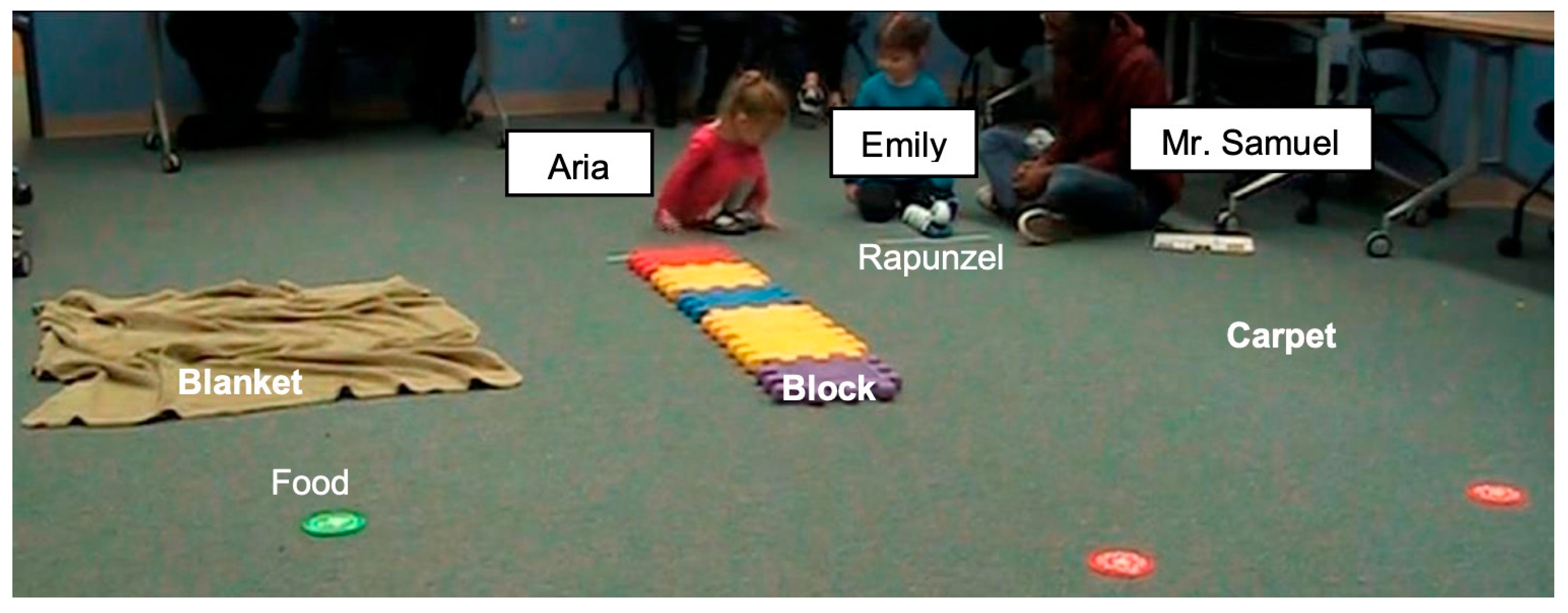 In addition, Emily’s manipulation of the blanket not only served as a practical attempt to overcome Rapunzel’s obstacle but may also have acted as an embodied cue that contributed to the unfolding collaborative sense-making process. While Mr. Samuel’s verbal prompt more directly cued Emily’s push, Emily’s ongoing adjustments to the blanket may have helped orient Aria’s attention toward the texture of the blanket. This interplay highlights how non-verbal gestures and verbal expressions can synchronize to scaffold mutual understanding, embodying what