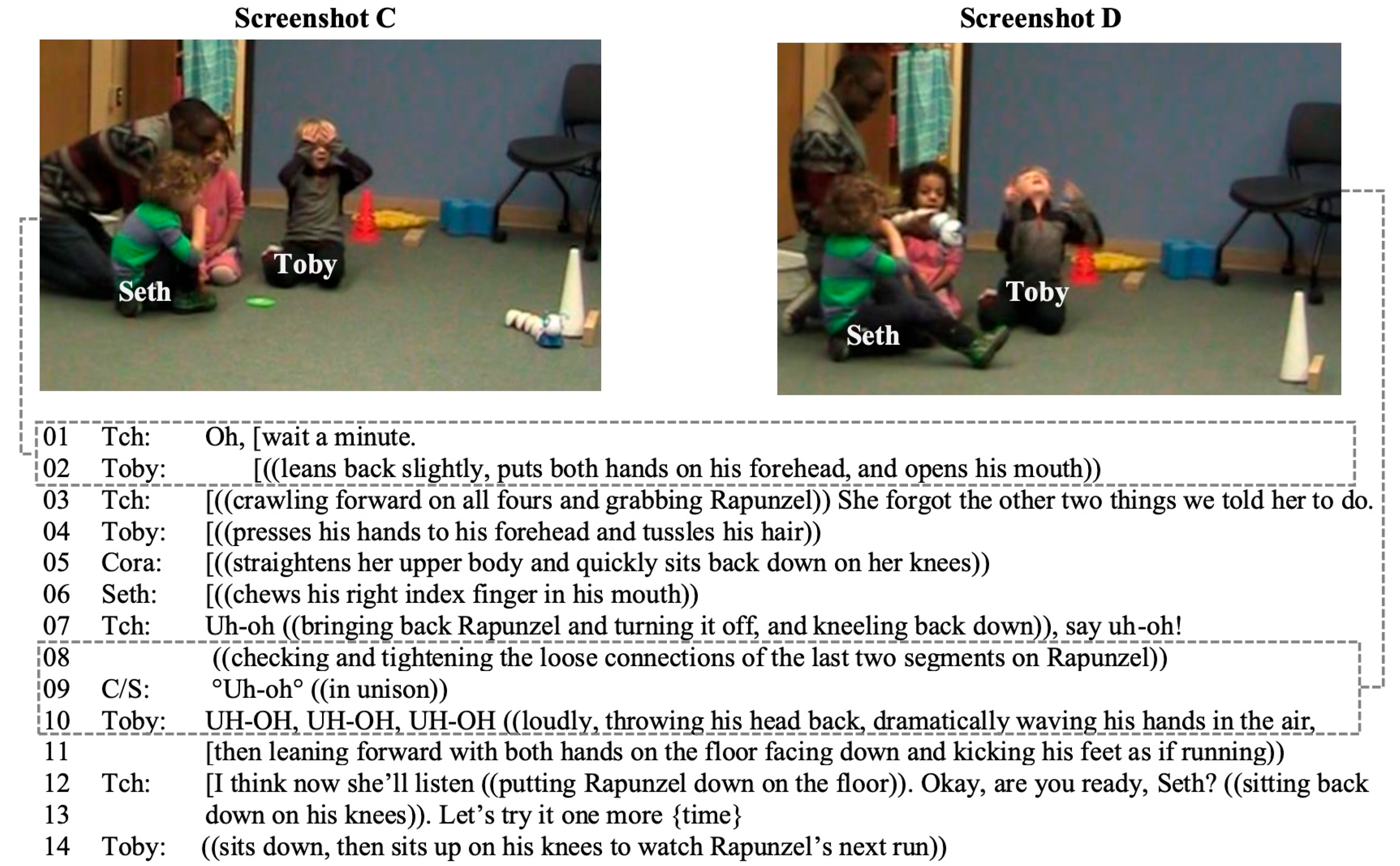 Excerpt 2 began, Mr. Samuel was surprised by Rapunzel’s premature stop (“oh, wait a minute” in line 1) but noticed the last two segments were not connected properly (indicated by his later action in line 8). Mr. Samuel light-heartedly remarked, “She forgot the other two things we told her to do” (i.e., turn left and turn right) (line 3). In response, the children used embodied displays to share their disappointment and frustration openly. Cora frowned and moved her body in a physical demonstration of “shaking off” the failed run (line 5), and Seth chewed his right index finger in his mouth (line 6). While Cora and Seth’s responses were somewhat subdued, Toby’s embodied display of disappointment was more intense—putting both hands on his forehead dramatically and opening his mouth (line 2, see Screenshot C). Noticing the group’s embodied displays of disappointment, Mr. Samuel orchestrated a collective vocalization of this embodied emotion, “uh-oh” to verbalize and label the felt tension (line 7). Toby took up the suggestion, saying “uh-oh uh-oh uh-oh” loudly while throwing his head back and waving his hands in the air (line 10, see Screenshot D) and then leaning forward with both hands on the floor facing down and kicking his feet as if running (line 11). After the physical display and using a shared word to describe the embodied display (“uh-oh”), the children quickly resumed the task with Mr. Samuel (lines 12–14).