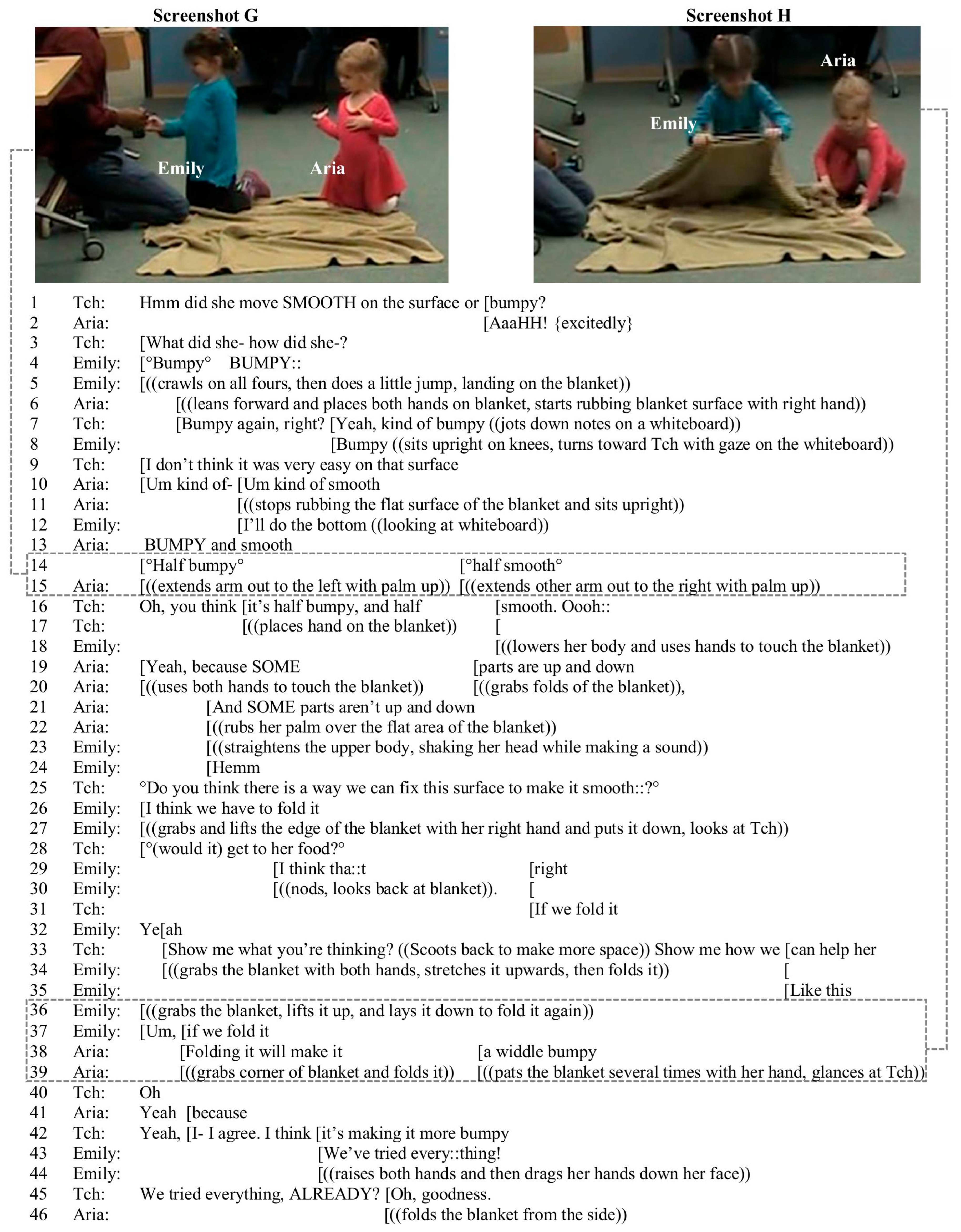 In this collaborative face-to-face problem-solving sequence, Emily and Aria frequently shift their attention and bodily positions in response to each other’s cues, indicating their embodied attunement to one another. Aria builds on Emily’s initial observation of Rapunzel’s movement by proposing it is “half bumpy, half smooth”, and Emily subsequently suggests “folding” the blanket to make it smooth. Aria then tested the strategy with Emily and evaluated the efforts, noting that folding “will make it a widdle bumpy.” Each child extends and builds on the other’s contributions. Such a reciprocal orientation fosters the we-relationship (