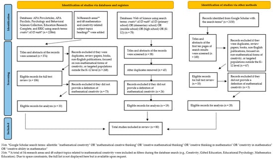 To enhance coverage and reduce cross-index selection bias, a third source, the Web of Science (WoS), was searched. The search was conducted using the following query in the title, abstract, and keyword fields: creativ* AND math* AND (primary school OR elementary school OR middle school OR high school OR K-12). English-language records and document types appropriate to our study scope were retained. The previously defined inclusion/exclusion criteria were applied directly. Duplicates were removed from the results of five databases and Google Scholar. Records lacking a clear definition of mathematical creativity were eliminated. Finally, 19 studies were eligible for review. With this addition, total number of studies were 80 (13 doctoral dissertations and 67 journal articles) were retained for analysis. The complete selection process is illustrated in a PRISMA diagram (Figure 1).
