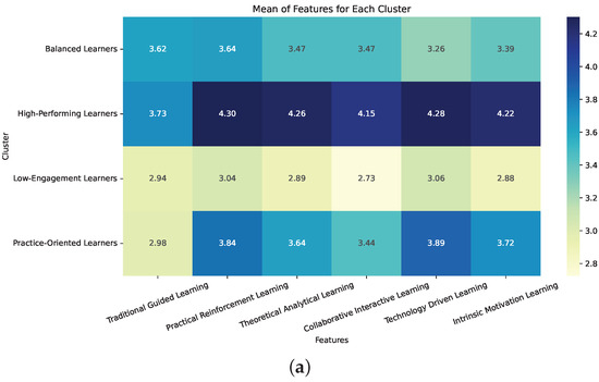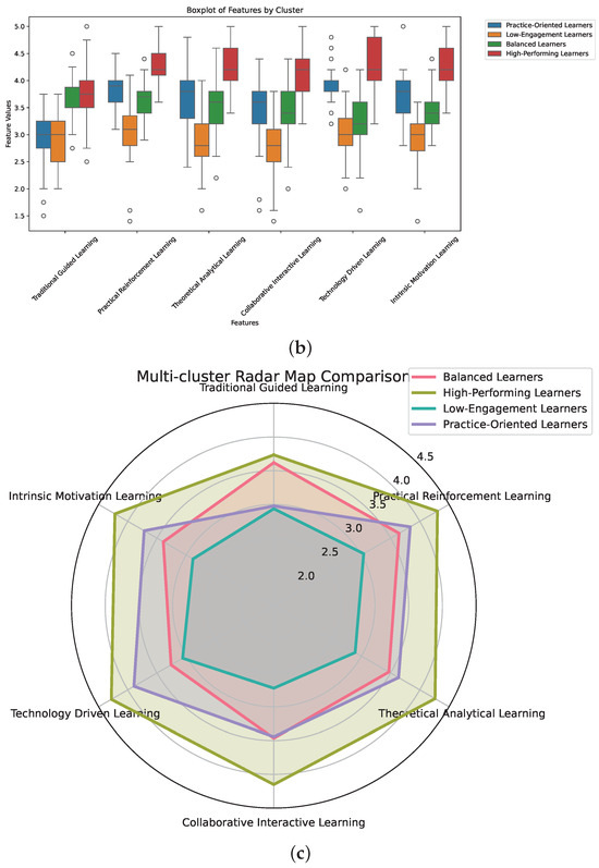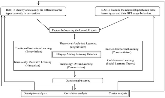 To achieve these objectives, we employed a combination of survey-based data collection and advanced statistical techniques (as shown in Figure 1). Our first objective was met through a detailed questionnaire designed to assess six learning orientations based on established educational theories (behaviorism, cognitivism, constructivism, social learning theory, connectivism, and humanism). The responses were then analyzed using cluster analysis, which successfully identified four distinct learner profiles: Balanced Learners, High-Performing Learners, Low-Engagement Learners, and Practice-Oriented Learners.