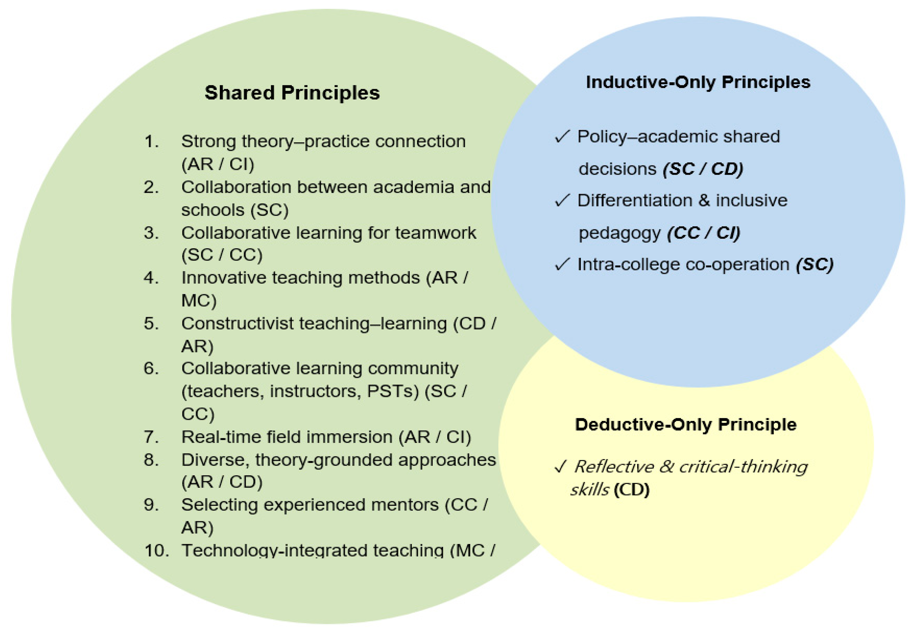 Diverse, theory-grounded teaching approaches | ✔ Multiple principles (#1, #2, #4, #10) | Adaptive roles/complex decision-making |
