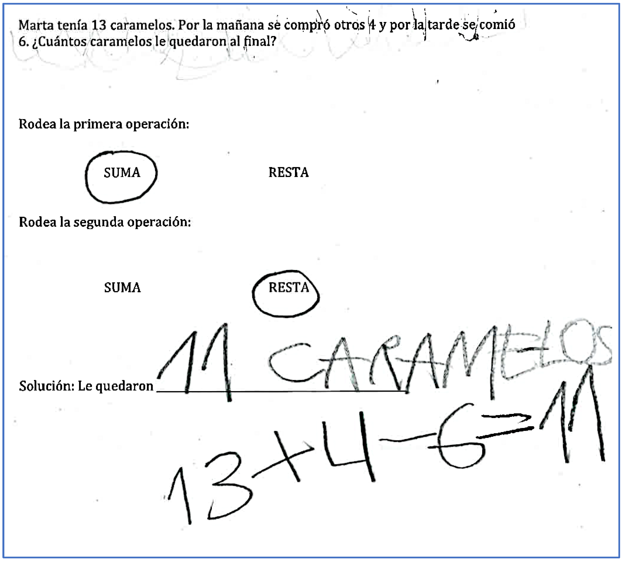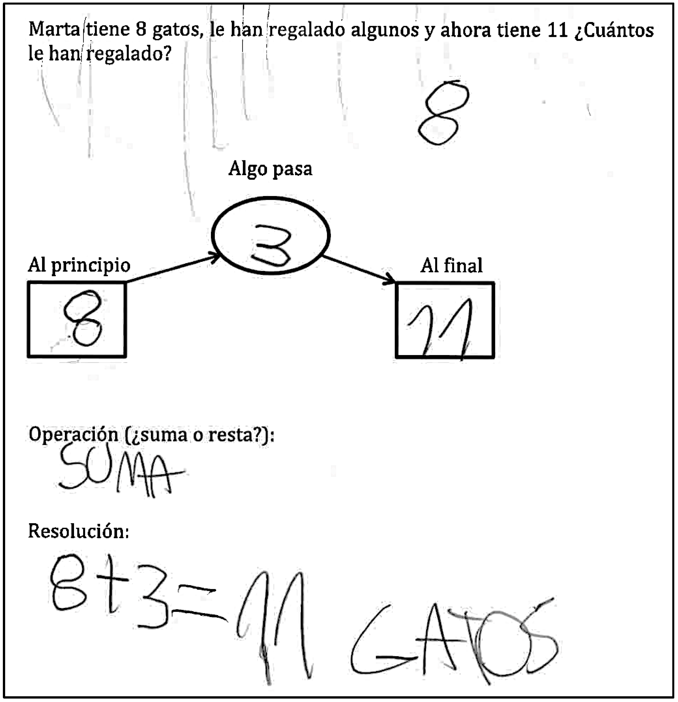In Study 1, a transition was observed from DA and DM strategies to a consistent use of operation strategies, which represents a significant advance in solving change problems, including inconsistent problems. Although there were some initial fluctuations, Peter quickly learned to transfer the problem data to the schema and correctly solved the DDU problems. In problems DUD or UDD, he had difficulty identifying the arithmetic operation, especially in inconsistent subtraction problems. On some occasions, he even provided the correct numerical answer despite choosing the wrong operation. This behavior aligns with his prior knowledge, which allowed him to model the situation and find the numerical answer counting, but was not effective and did not help him advance his understanding of arithmetic operations. He overcame this difficulty from instructional session 4 onwards, when he successfully solved problems involving large numbers. At this moment, the initial steps of the guiding-questions sheet also proved particularly useful. Deciding whether the situation was about “getting more” or “getting less,” and circling the larger number, helped Peter better understand DUD and UDD problem statements. Additionally, the final step of the guiding-questions sheet—interpreting the obtained solution—was very relevant: since Peter had a good understanding of change stories, rereading the problem while incorporating the numerical solution allowed him to check the correctness of his response. Therefore, the objective of helping Peter connect addition and subtraction operations to the situations described in the problems (