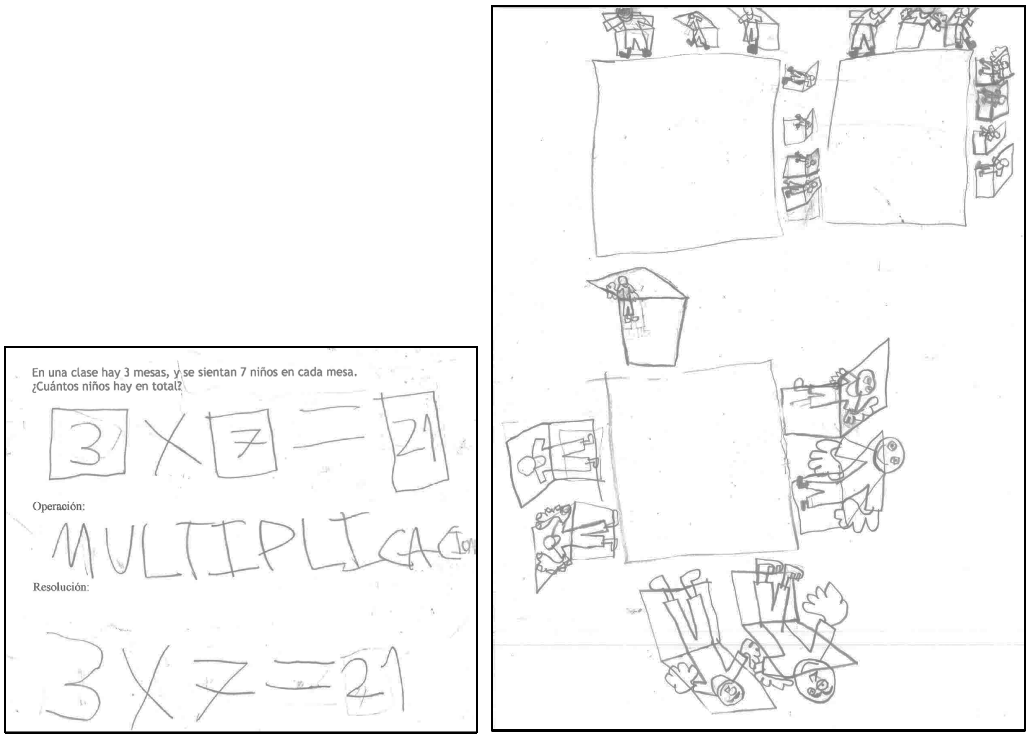 Nesher, 1992): equal-group problems, where a certain quantity is repeated a given number of times (e.g., “There are 5 tables in a classroom. At each table, there are 4 chairs. How many chairs are there in the classroom?”); comparison problems, in which a quantity is compared to a reference based on a multiplicative factor (e.g., “Mario has 3 marbles. María has 4 times as many marbles as Mario. How many marbles does María have?”); percentage or proportion, where cross-multiplication and equivalence fractions are used to solve them (e.g., “George inflates 3 ballons in 2 min. How many ballons will he inflate in 6 min?”); and Cartesian product problems, where all possible combinations between two sets are considered (e.g., “In her closet, Claudia has 3 shirts and 2 pairs of pants. How many different outfits can she wear?”). Multiplicative problems may involve either multiplication or division, depending on the unknown quantity. Moreover, multiplicative comparison problems can also be classified as either consistent or inconsistent, based on whether the language used provides a clear indication of the required operation.